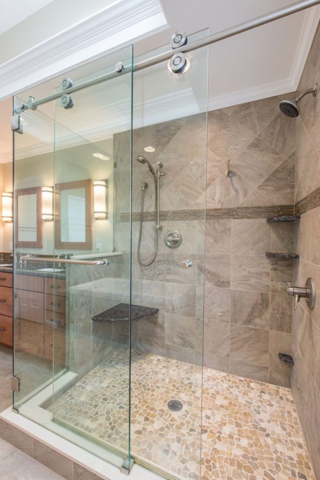 Today, showers can be just as lavish as soaking tubs. With multiple shower heads, sprayers, seats and gorgeous tile walls and flooring you’ll feel like you are at your favorite hotel or spa. Sliding glass doors allow plenty of light flow into shower and also keep the bathroom feeling open.