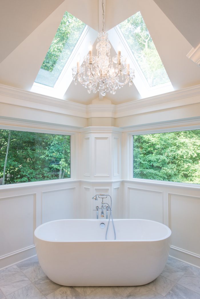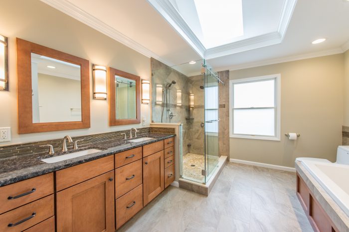 Lighting is one of the most important design elements of a bathroom remodel. Done correctly, it will allow you to easily complete your daily routine and set the appropriate mood in the space. As shown above, this requires multiple sources of light including natural, overhead, task, and accent lighting.
