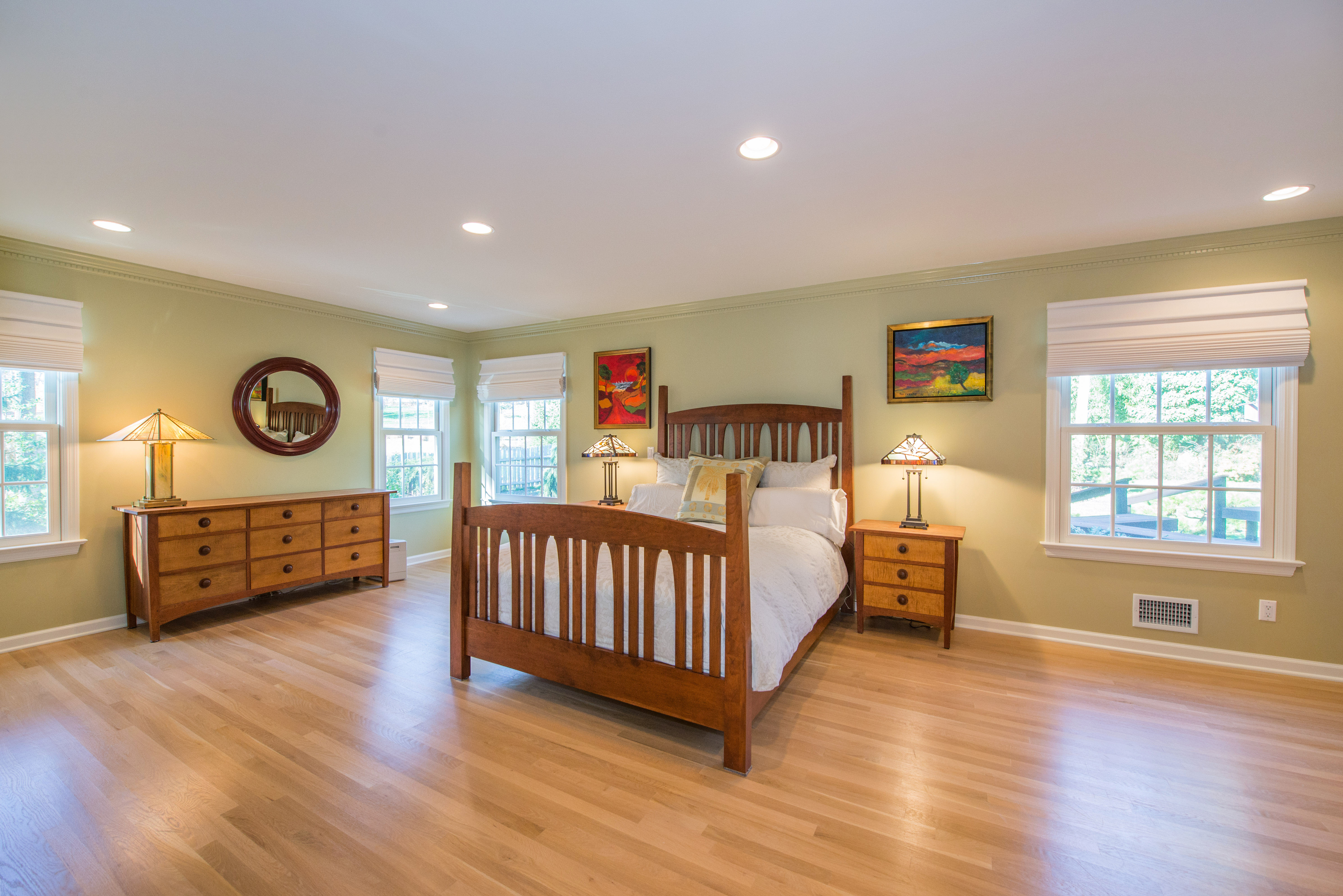 Custom, double pocket doors invite you into the 25-foot wide, light-filled bedroom with generous floor space to maneuver around the bed and furniture. Hardwood floors, recessed lighting and window views to the owner’s gardens make this bedroom particularly warm and inviting.