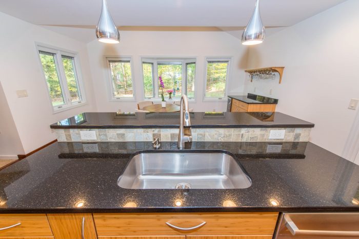 To create the contemporary design aesthetic they were seeking, the clients selected caramelized bamboo cabinets with a modern, flat styled door. Sleek stainless appliances, chrome pendant lights, and a ceramic tile backsplash compliment the new cabinetry.